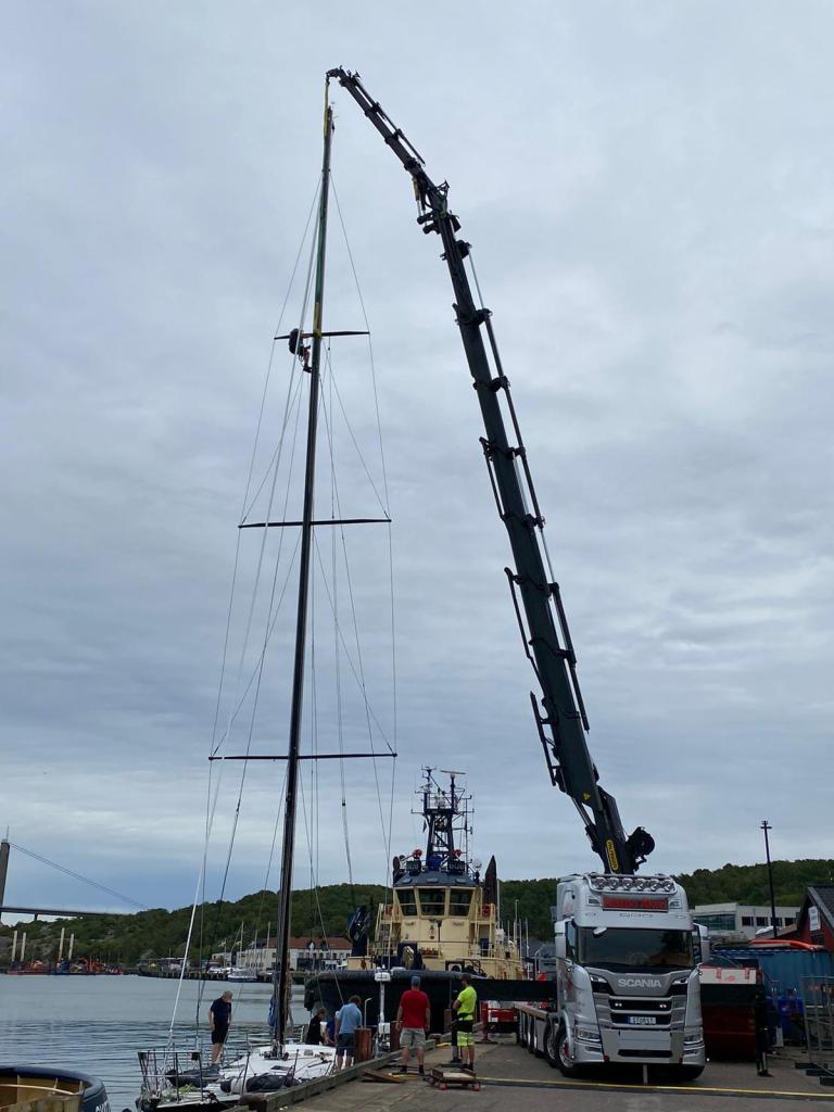 Den 1 augusti förbereddes masten för lyft och den 2 augusti togs masten av på Celeste. Nu stundar arbete med byte av stag och vant, byte av toppenhet för vinddata samt genomgång av masten i övrigt.