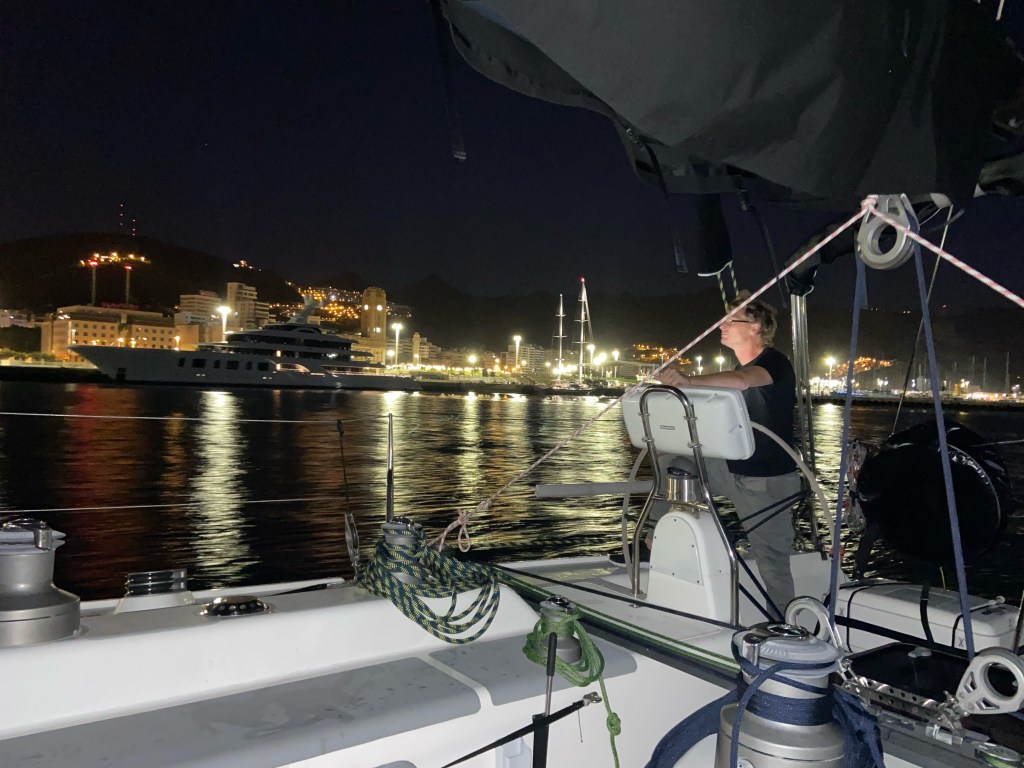 I gryningen lägger vi loss från Santa Cruz de Tenerife efter en veckas fix, meck, mountainbike samt chill på båten. Vi har härlig segling i strålande väder. Det blåser 23 knop och vi seglar stundtals i 12 knop. När vi rundat Teneriffas södra udde dör vinden ut och vi går för motor och spanar efter en Grindvals-koloni som finns i detta område. Vi ser tyvärr inga valar och det blir bad från båten istället i 24-gradigt vatten. Strax efter badet kommer en familj med delfiner och simmar med oss och sen kommer äntligen två grindvalar vid ytan alldeles vid båten. En fantastisk naturupplevelse.