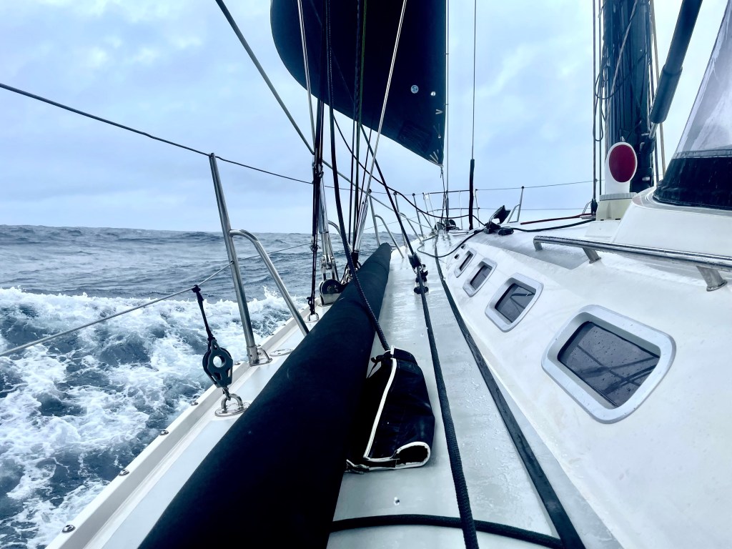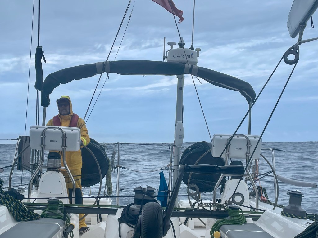 Segelföringen under natten är full stor och Jib # 2. Vi försöker att hålla upp nord så gott det går i den tidvis besvärliga dyningen blandad med vågor. Vi har nu kommit så mycket öster ut att vi hamnat i ny tidszon. Vi ställer fram DWT (Deck Watch Time) en timma under nattpasset 00-03, vilket medför att detta blir förkortat med en timma. Detta är oftast det mest jobbiga passat och vår planering är att kommande tidsändringar också ska ske under detta pass. Vi har fått lite val-ljud från vår hydrofon de senaste dygnen, men inte sett någon val. Kanske att Sonja såg sprutet från en Kaskelott igår. Nu närmar vi oss den Atlantiska ryggen med uppgrundningar, vilket också ökar chanserna för att höra och se val. För första gången på rutten får vi regn. Det har också kommit kraftigare nattdagg, vilket gör att det blivit betydligt fuktigare ombord. Den klarblå himlen har bytts ut mot moln och lufttrycket har gått ner 10 mbar. I gengäld har vi stabil fin vind mellan 15-25 knop. På eftermiddagen spricker det upp och vinden tilltar ytterligare. Vi planerar för att ta två rev i storen. När storen ska hissas under revningsmomentet upptäcker vi att en latta lossnat från sin vagn i masten. Vi tar ner storen helt och härefter följer reparation med utbyte av delar. När arbetet är klart hissas storen igen med två rev och vår gång blir åter stabil. Att segla med bara Jib # 2 ger inte tillräcklig stabilitet eftersom båten gungar i atlantdyningen och kraften i seglet är för litet för att bära mot. Med två segel satta ges dock den kraft som behövs för behaglig gång.