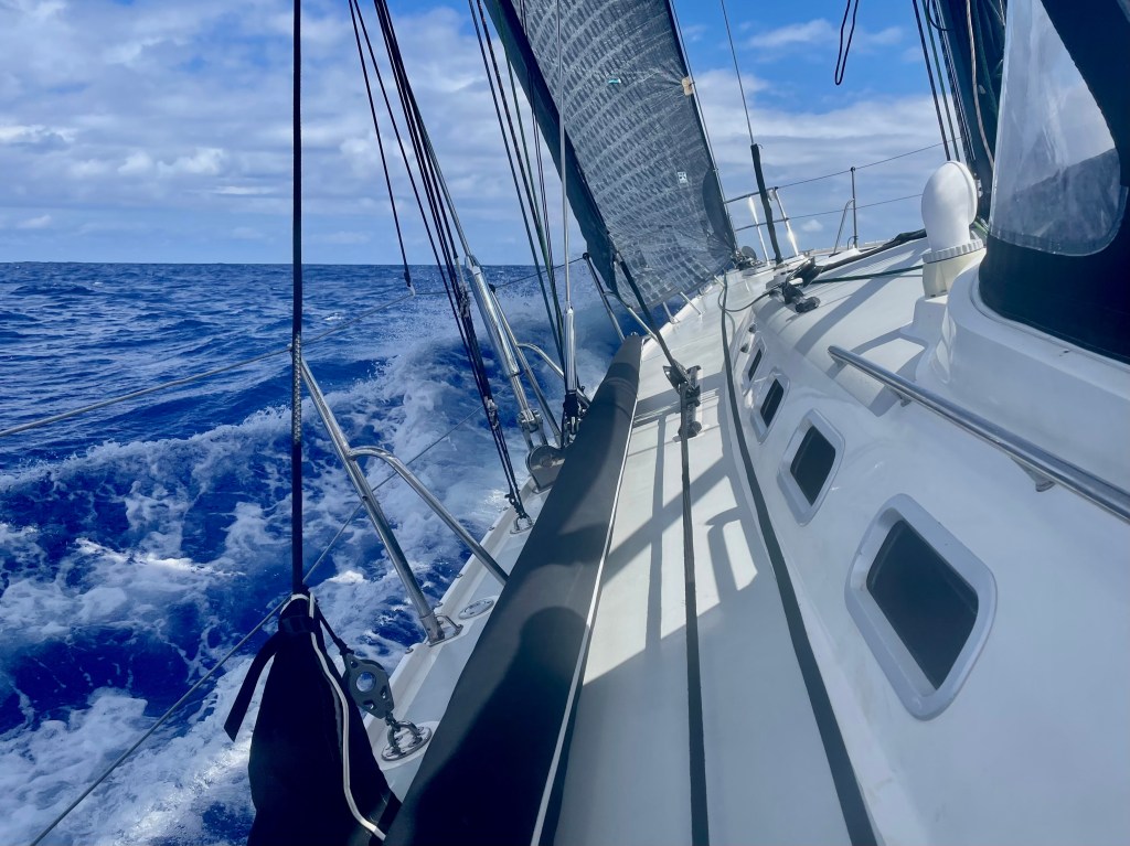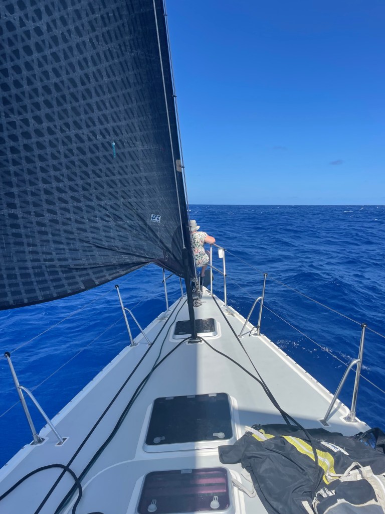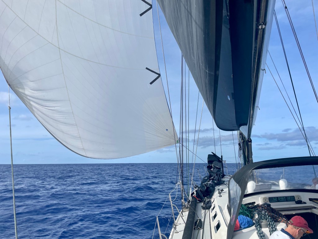 Det är relativt svårstyrt under natten i den svaga vinden med låg vindvinkel. När ljuset kommer framåt femtiden blir det lättare. Vinden ökar på förmiddagen och det ser ut som om vårt ruttval och våra metereologiska data stämmer. Vi har en härlig segling för full stor och Jib # 2. Vindvinkeln är cirka 120 grader AWA (Apparent Wind Angle, Skenbar vindvinkel) och vi loggar mellan 7-10 knop. Det är nu också så behaglig temperatur att det går att vara i solen utan att bli stekhet. Vattentemperaturen har gått ner från 28,7 grader utanför Guadeloupe till 22,2 grader vid vår nuvarande position (N 29 grader 50 minuter och W 53 grader 01 minuter). Vår toppnotering blir 12,8 knop. När det mörknar blir det svårare att styra på grund av att det är svårt att läsa sjön (se vågorna etc. i förhållande till båten).