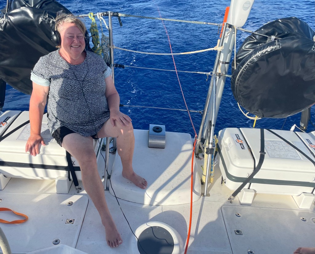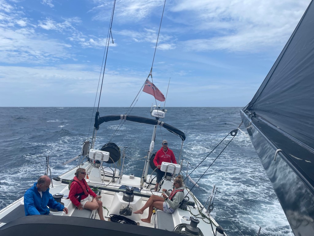 Under natten har två rev i storen och Jib # 2. Det är tidvis för lite segelyta och på morgonen tar vi ut båda reven och seglar med full stor och Jib # 2. Det blir lite lättare att styra eftersom det är mer tryck i seglen och farten ökar med cirka 1 knop. Det blåser mellan 15-20 knop och vi loggar mellan 7-10 knop. Idag fyller Mia T 50 år vilket vi firar med ombordgjord bakelse, kaffe, present och Quiz. Trevliga frågor som Sonja kommit på som beskriver varje person ombord. Med hjälp av beskrivningen ska det gissas vem personen är. Mia R visar sig fenomenal och får 12 rätt av 12 möjliga.