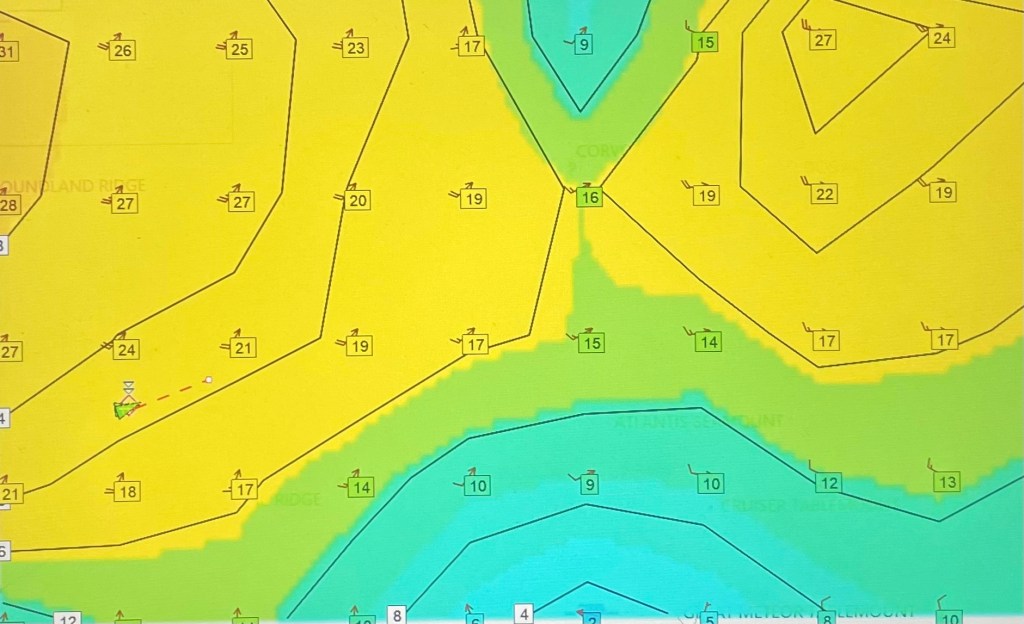 Vinden kommer tillbaka på morgonen och vi sätter Jib # 2. Det är lite svårt att styra i den lätta vinden som ligger mellan 3-7 knop. Med lite öppnare vindvinkel (AWA, Apparent Wind Angle, Skenbar vindvinkel) på cirka 50 grader når vi tidvis farter upp mot 6 knop. Det ligger ett starkt lågtryck väst om Azorerna och detta har tryckt undan det Azoriska högtrycket som synes letat sig ner till farvatten utanför Västindien. Normalt blåser här vid denna årstid en ostlig stadig vind på mellan 10-20 knop, men denna har ersatts av ett mycket starkt högtryck med lite vind.
