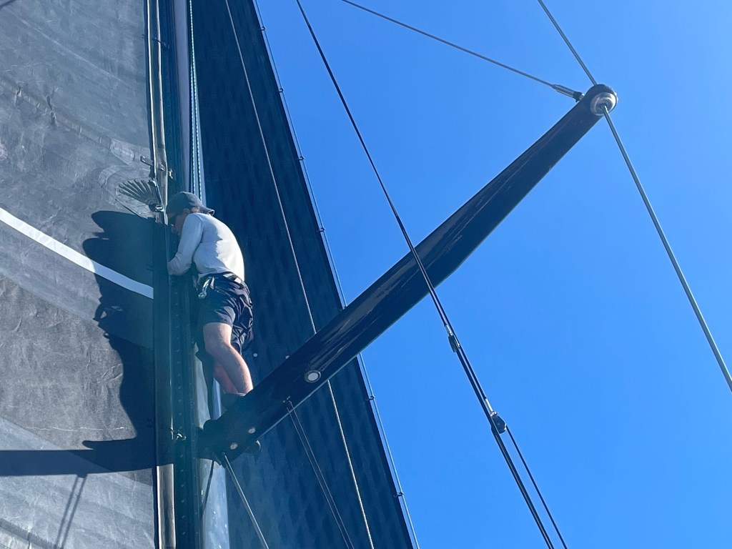 Vinden håller sig kring nord-ost på cirka 5-10 knop hela dagen. Vi seglar för stor och Jib # 2. Det är fortfarande väldigt varmt och platserna med skugga på båten är åtråvärda. I den stabila lätta vinden passar vi på att dra om akterlikssträckaren till storseglet som varit feldraget. Oskar gör en god insats uppe på första spridaren.