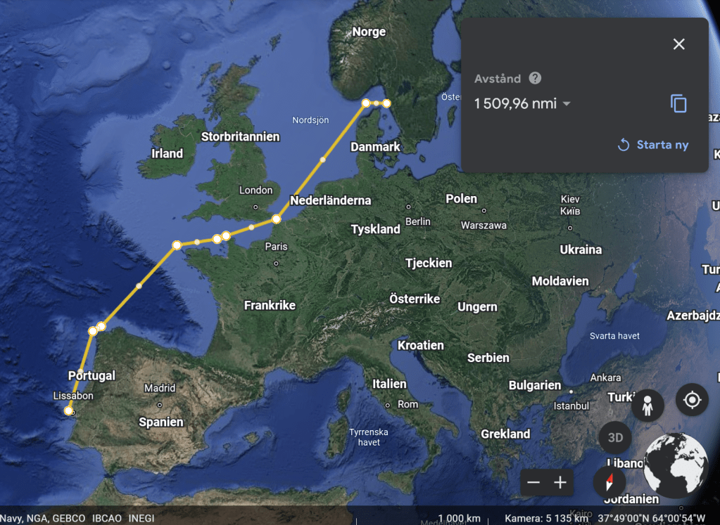 Vi seglar ut från Långedrag i Göteborg. Seglingen går ut på Kattegatt, norr om Danmark, förbi Skagen och sydväst ner över Nordsjön mot Engelska kanalen. Första stoppet är planerat att ske på Kanalöarna och Guernsey eller södra England efter cirka 1 000 NM.