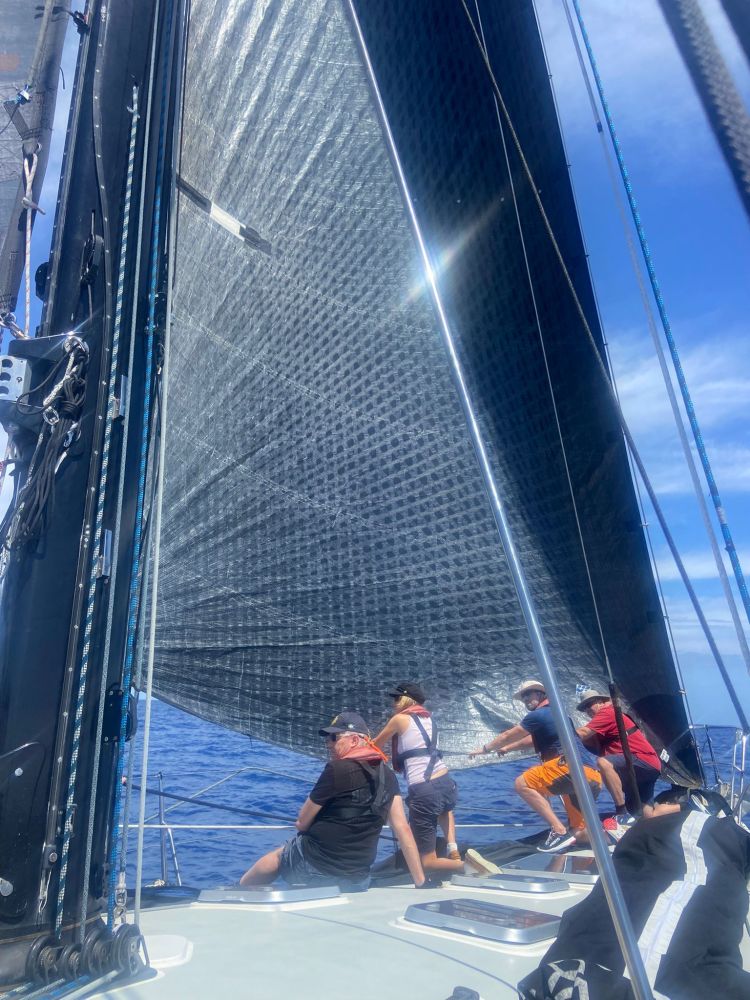 Then came the unexpected: a rogue squall from a cloud we thought harmless. Winds jumped to 35–40 knots with a 50-degree shift. Celeste surged and broached despite all hands easing everything they could. The mighty red spinnaker split in two. We recovered it all, shaken but safe, and debriefed as a team – learning, laughing, and pressing on toward our West Indies destination.