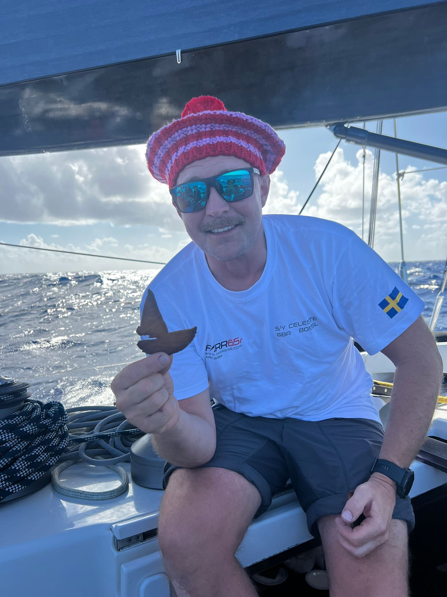 Nu har vi precis gippat över mot väster igen och styr i princip rakt mot mål. Det har varit arbetsamt att ta oss söderut, men nödvändigt för att nå den riktiga passadvinden. Hissningen efter gippen blev lite väl spännande när en softschackel i lovartskotet släppte och hela spinnakern flög ut i lä, men den duktiga besättningen var snabbt på det och bärgade alla 350 kvm. Nu sitter kvällsvakten och njuter av spinnnackersegling i 10-12 knop i skenet av fullmånen å kursen är ”rumpunsch”