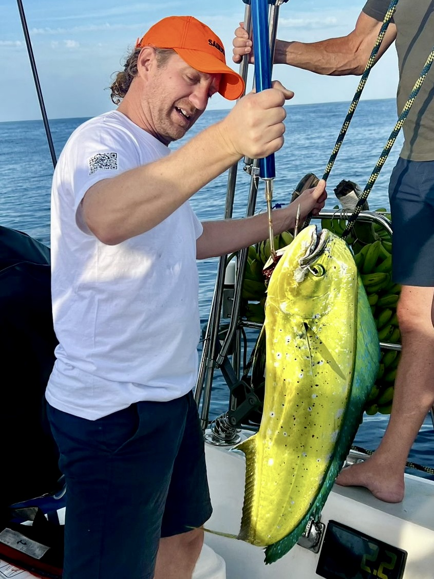 I morse hade vi tagit tillbaka andraplaceringen. Vi valde dock att gippa söderut på morgonen för att möta bättre vind. Vi prickade ett vindvrid väl och har större delen av dagen kunnat utnyttja det. Vi var dock ganska säkra på att tappa 2 placeringar och mycket riktigt är vi nu nere på plats 4 i vår klass, men med små avstånd till tvåan och trean. I morse upptäckte vi oroväckande höga temperaturer i kylen och frysen. En stor del av dagen har därför ägnats åt felsökning och till slut konstaterades att kylmedlet har läckt ut. Vi bytte kompressor och styrsystem i Las Palmas och detta fel var minst sagt oväntat, sannolikt en svetsfog som är bristfällig. Eftersom felet är omöjligt för oss att åtgärda mitt ute på Atlanten så blir det en lite annorlunda meny för resten av resan. Tur då att co-skipper Johan Billström är kock när han inte seglar. Han har tagit höjd för alla eventualiteter så vi kommer äta gott ändå. Passande nog så drog Tor upp guldmakrill nr 3, en riktig bjässe som räckte till middag för hela besättningen.