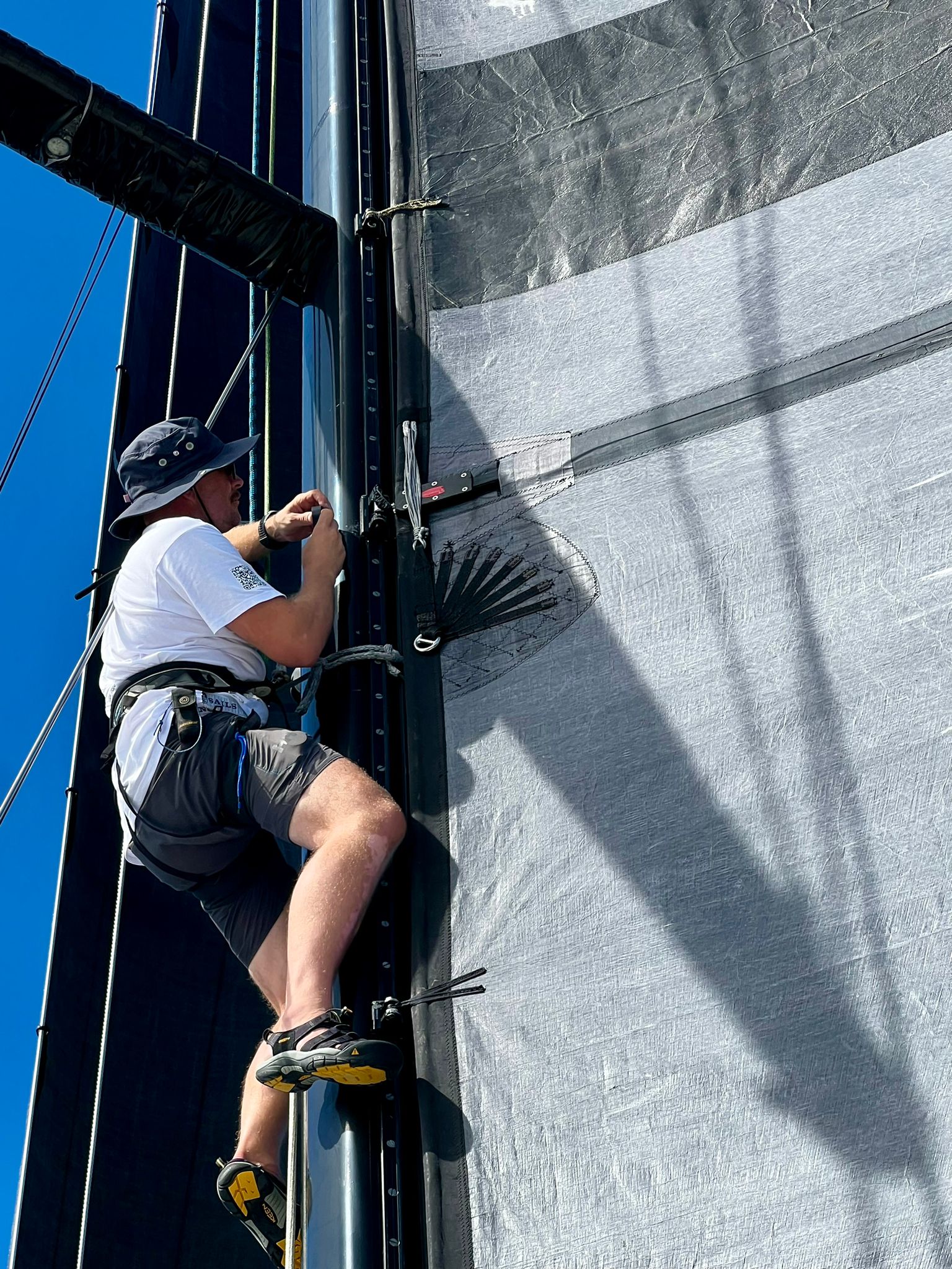 Ännu en hektisk dag på Atlanten. Vi styrde söderut hela natten för att etablera oss i ett nytt vindområde. Eftersom det innebar en kurs som inte bar så bra mot St Lucia så visste vi att vi skulle tappa mot våra konkurrenter och mycket riktigt halkade vi ner till en åttonde plats. På morgonen hade vi planerat att gippa över mot väster. Vi upptäcker då att höljet på styrbords spinnakerfall är helt trasigt och endast dynemakärnan är kvar. I praktiken innebär det att vi inte kan ta ner spinnakern eftersom fallet skulle fastna i toppen. Vi diskuterar olika sätt att lösa det på och kommer fram till en plan. Vi går igenom den för att säkerställa att vi inte missat något. Det är en säkerhetsfråga eftersom en person måste upp i masttoppen samtidigt som vi seglar. Planen är att koppla om till babordsspinnakerfall i toppen för att avlasta styrbordsfallet för att kunna ta med sig det ner. Denna lösning minimerar tiden i masttoppen samtidigt som vi kommer att ha båda fallen tillgängliga för resten av seglingen. Under planeringen får vi dessutom ett felskär i en våg, spinnakern tappar luft och trasslar in sig lite i förstaget. Efter en stark besättningsinsats så lyckas vi till slut reda ut det hela. Dags för mastjobbet. Co-skippern Johan tar mastjobbet och kommunikationen med däck sköts med VHF. Hela operationen går utmärkt tack vare god planering och fokus på säkerhet. Med en person i masttoppen ute på Atlanten i 10-13 knop är det också viktigt att ha rätt person vid rodret. Vi kunde nu ta ner spinnakern, gippa över mot väster och sedan hissa igen. Vi har sedan haft full fart mot St Lucia och försöker plocka ikapp en del av det vi förlorat. Det bär bra mot mål, vinden växlar mycket i både riktning och styrka och det kräver vaksamhet vid rodret. Vi gör mellan 10 och som mest 14 knop. Under lördagen kommer vi få första indikationen på hur väl vi lyckas. Nu 700 sjömil öster om St Lucia.