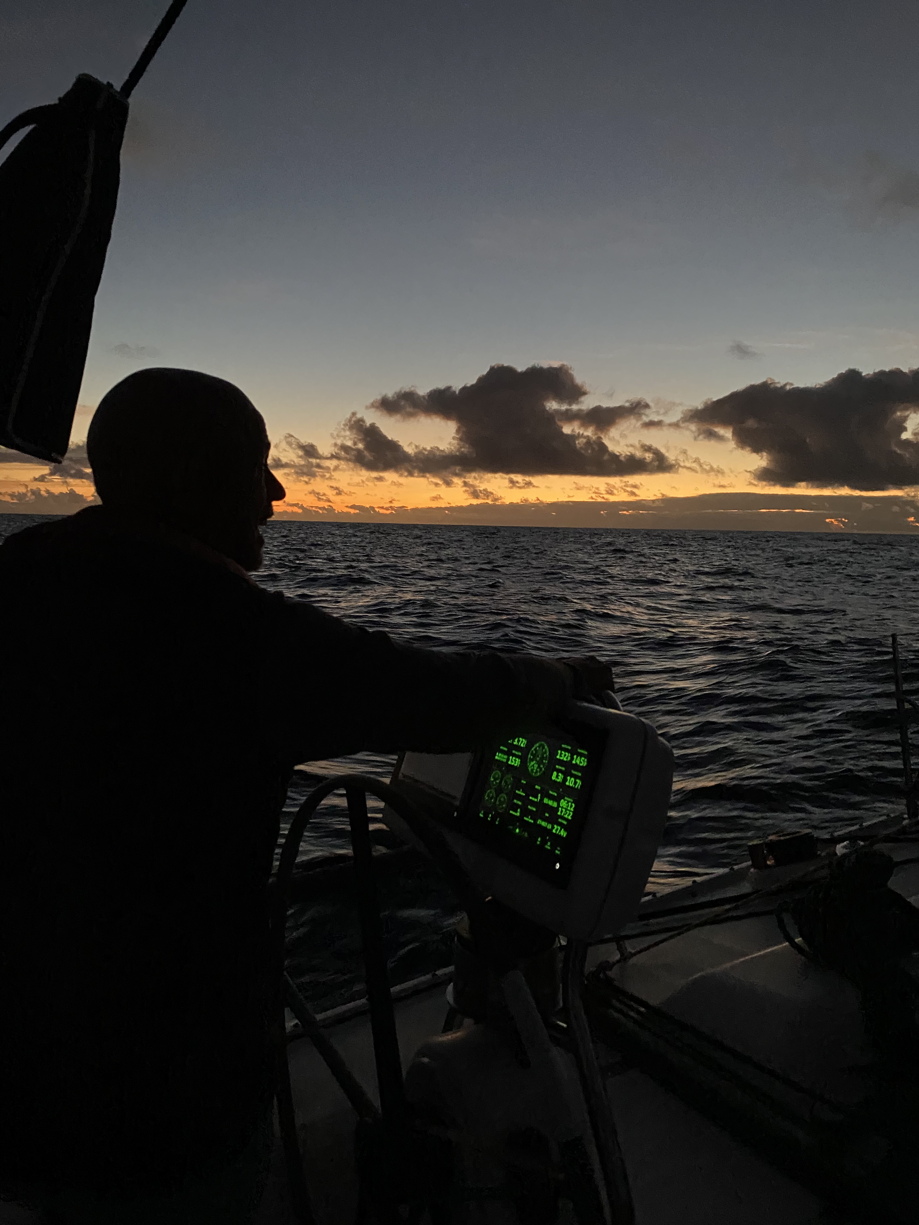 Det har varit en svår dag. Svår sjö och lite vind har gjort det utmanande att stå vid rodret. Vi har även haft ett ogynnsamt vindvrid. Trots detta behåller vi vår andra plats, men avståndet till första platsen har ökat, inte så konstigt eftersom det är en välseglande 82- fotare som ligger först. Tidigare idag tog vi ner spinnakern för att kontrollera fallet, vi fick kapa en dryg halvmeter eftersom vi har ett problem med nötning i toppen av masten. Vi vill helst inte skicka upp någon i masten för kontroll och åtgärd, 32 meter i den här sjögången är inte så roligt. Vi passade även på att köra watermakern eftersom vi bara kan göra det vid max 6 knops fart. Vår placering i fältet är i den norra delen och kanske den minst gynsamma. Det är lätt att förivra sig och agera lite kortsiktigt för att det händer något. Då gäller det att komma i håg att det är 1000 nm kvar och mycket kan och kommer att hända. Man måste våga hänga i och tro på sin strategi. Nu väntar en natt som sannolikt blir händelserik om man ser sig omkring, kommer vi få vår första squall tro….