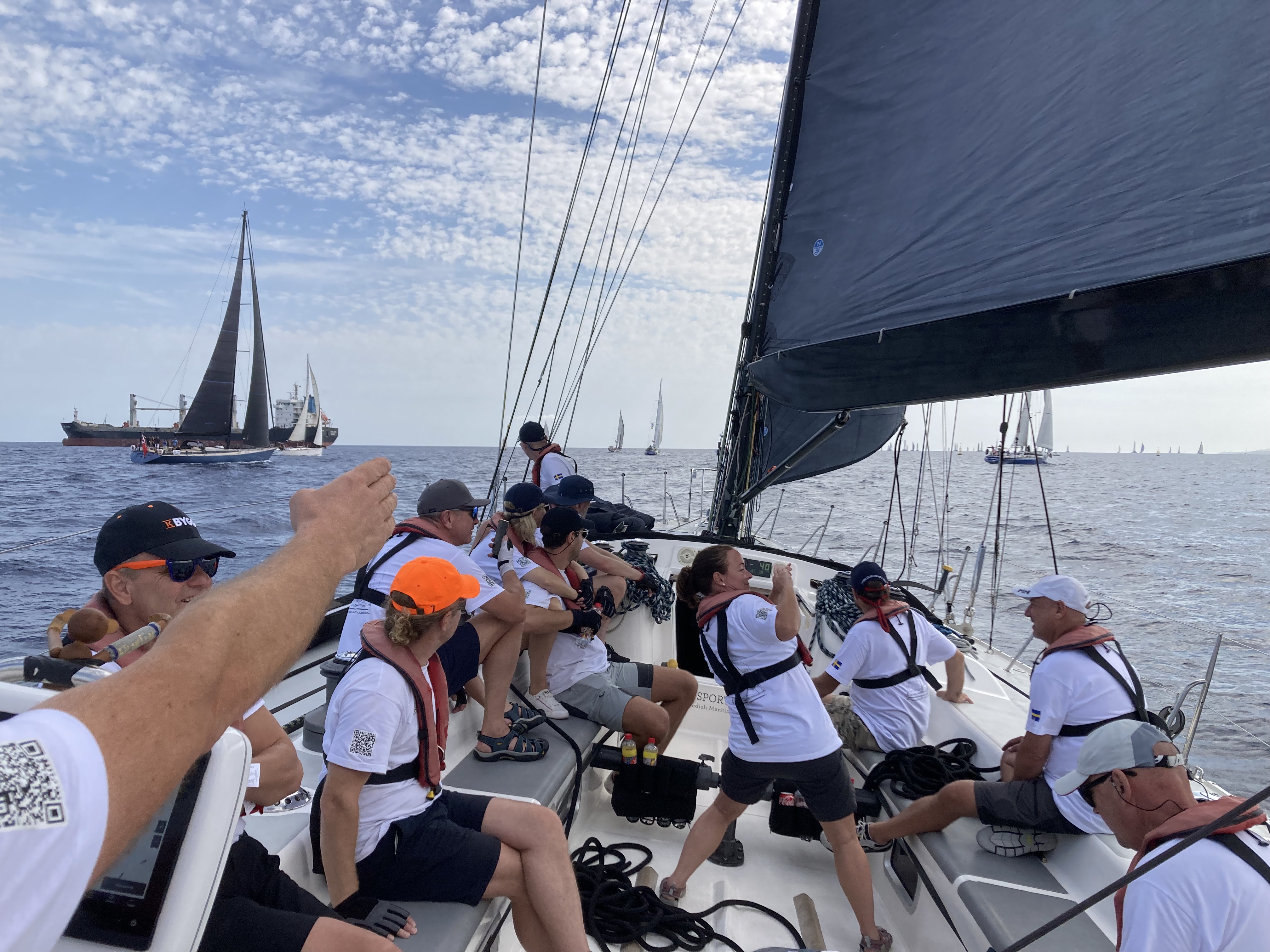 As the wind shifted further aft, it was time for the big red one: our 350 sqm spinnaker – the largest sail on Celeste. Hoisting it took teamwork: halyards, guys, sheets, downhauls – a full ballet of sailing terms and muscle. Once flying, she pulled us like a rocket toward the horizon.